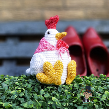 Crochet pattern by Henny Hen, the cozy chicken with shawl