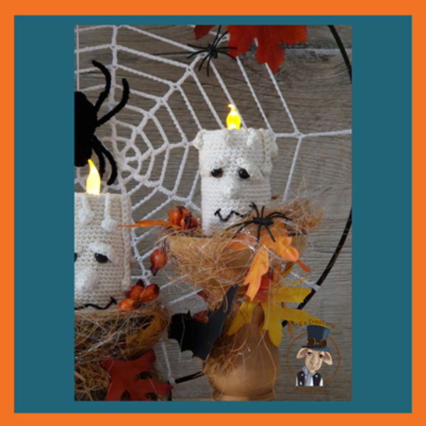 Two spooky candles: Crochet cream-colored candles with cheerfully creepy faces, complete with eyes, eyelids, nose, and mouth. The "drips" around the candles complete the effect. Simply place an LED tea light inside the candles to make them really glow and create a warm, spooky atmosphere!