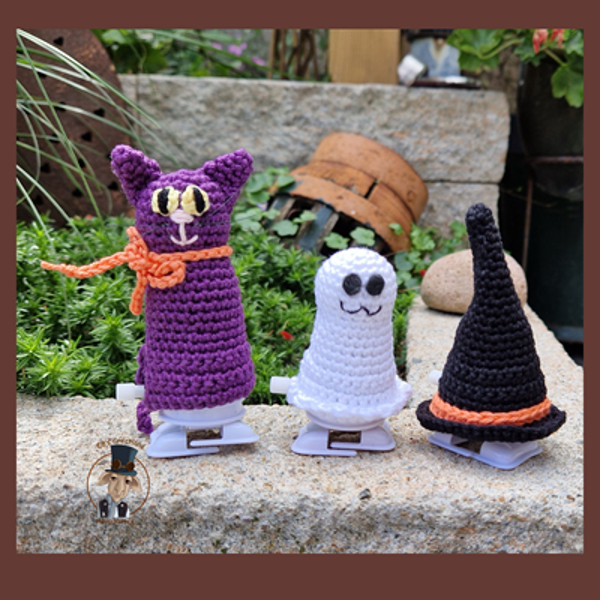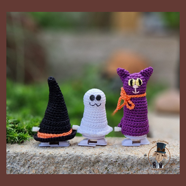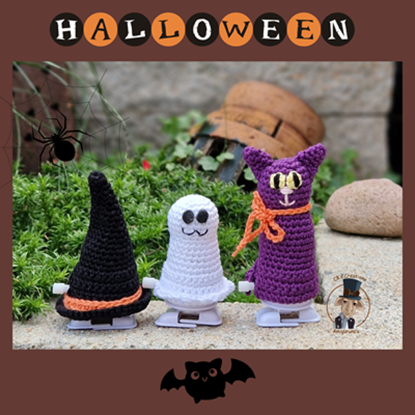 Amigumi crochet pattern of a Halloween Cat, a Ghost and a Witch hat with wind-up feet