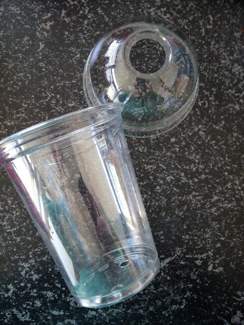 - Plastic cup with round lid , Sizes: Diameter bottom 6cm, diameter top cup 9cm, height 11cm, height including lid is 14cm.